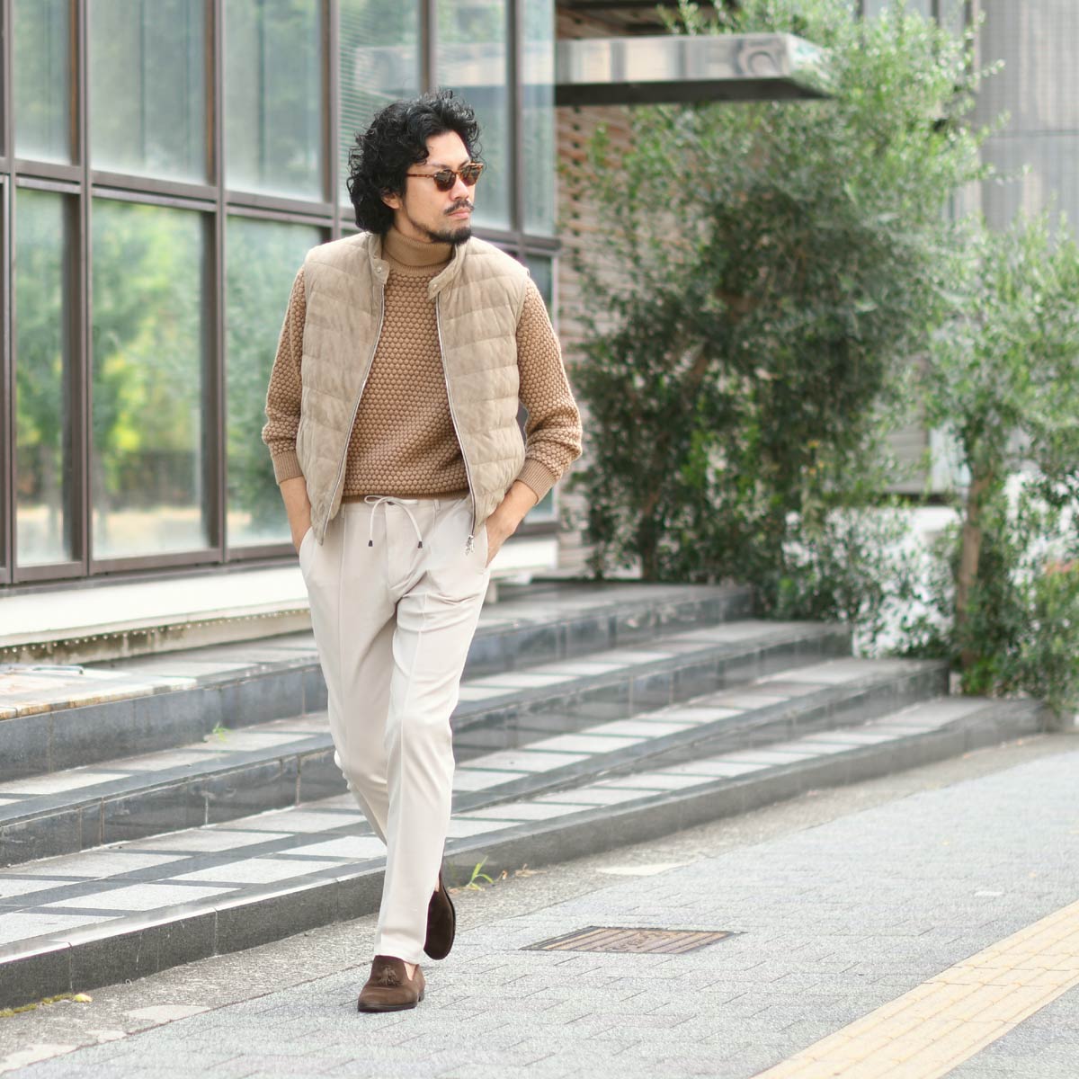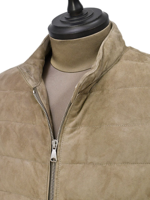 シンプルなデザインにスッキリしたJURIならではのすっきりしたサイズ感の1着はベストになることで見た目にも新鮮味があり、着回しの幅も増えてきます!!ダウンも控えめな分量が入っており、洗練されたシルエットはそのままに、ステッチが入る事でダウンベストらしい面構えに。素材はそのシーズン毎に 数十着の限定で提案される特別なレザーを使用、大手メゾンブランドが僅かに使い切らなかったレザーをブランドが買取、日本で数量限定でご用意した最上級のレザー。周りとは一味も二味も違う、ラグジュリーな存在感を発揮しますその佇まいはまさにブランドのコンセプトである”エレガンテスポルティーヴォ"を体現する極上の逸品です。是非この機会にダブルジャケット”JURI DOWNVEST”を纏ってみては如何でしょうか。