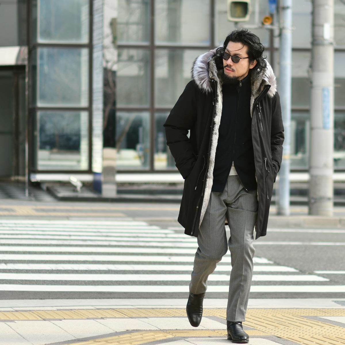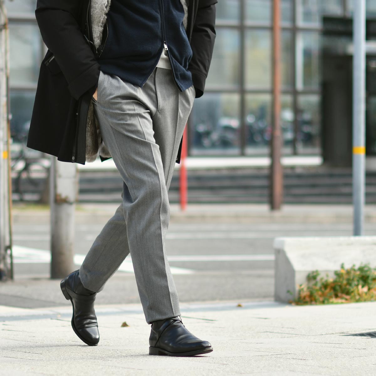 防寒性と耐久性、そして独特の光沢感を持つのがウールギャバジンの生地感で、発色の良い美しいカラーも相まって単色ながらも洒脱感を醸し出します。