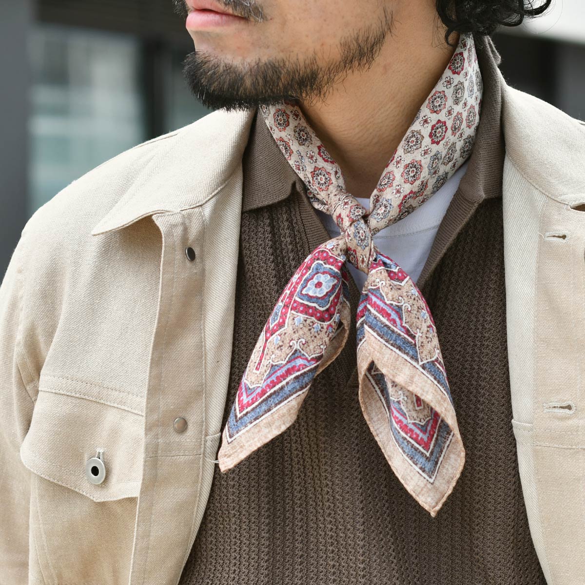 約60m角の1枚は、首元にもコンパクトに収まり非常に使い勝手の良くスタイリングのアクセントに。